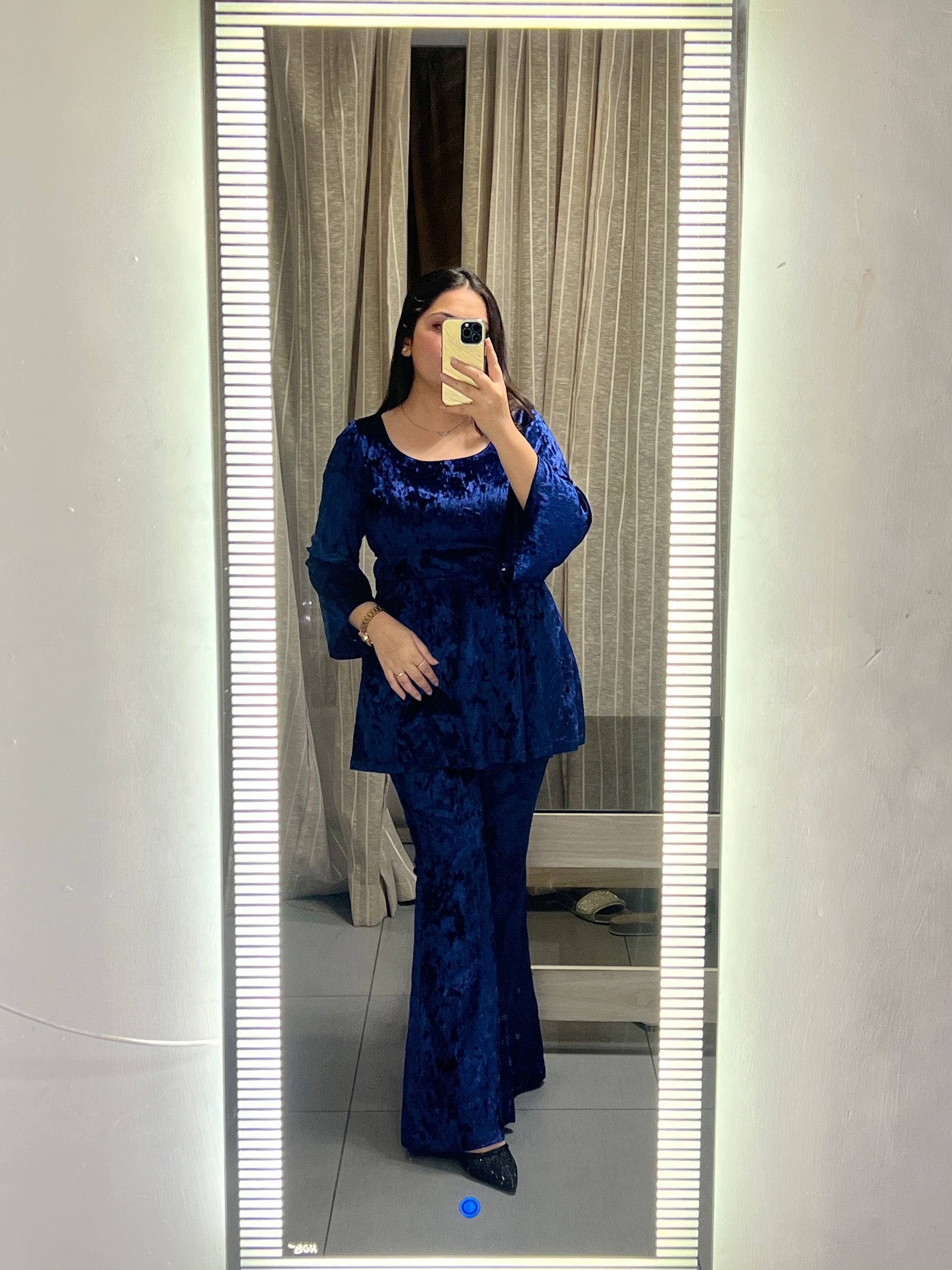 Neel kurta set features a peplum-style velvet kurta paired with velvet bell-bottom pants, offering a cozy and stylish winter look.